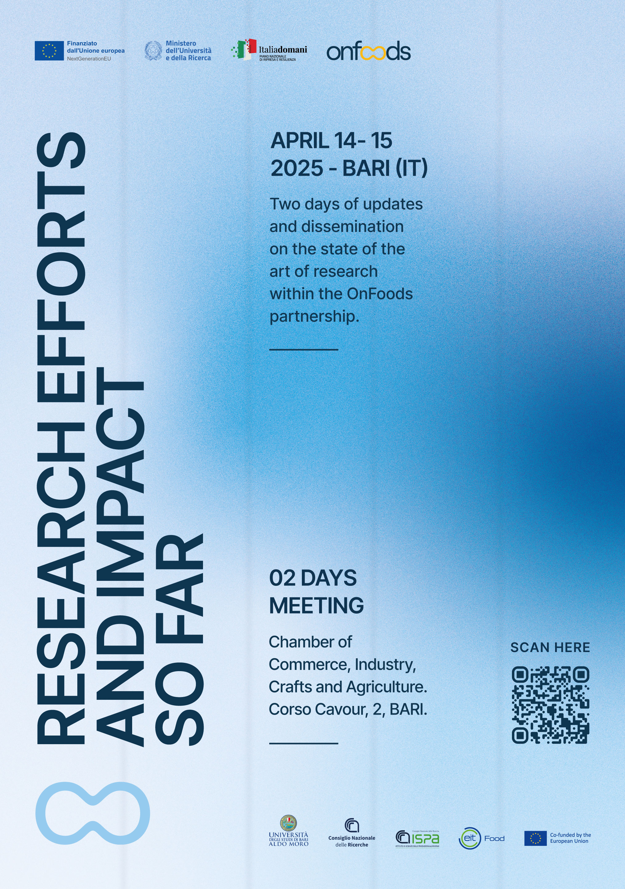Opening remarks will be delivered by the Rector of the University of Bari, Stefano Bronzini, together with Daniele Del Rio, Chair of the OnFoods Foundation Board, Maria De Angelis (University of Bari), Antonio Moretti (CNR), Marina Heinonen (University of Helsinki), Vincenzo Fogliano (Wageningen University), Fabrizio Cobis (Italian Ministry of University and Research), and Lucia Di Bisceglie (Bari Chamber of Commerce).